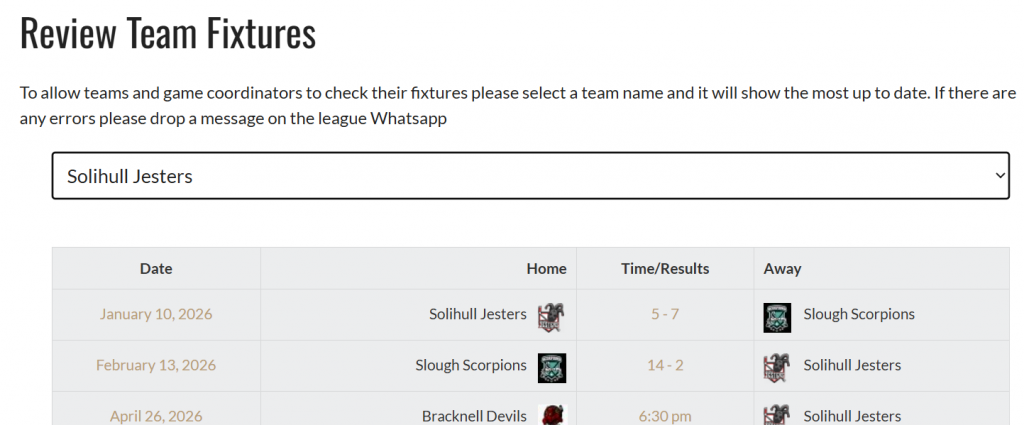 In order for teams to check their fixtures and those of their opponents then a Team Select page has been added under the Team Info. pages, CHECK TEAM FIXTURES